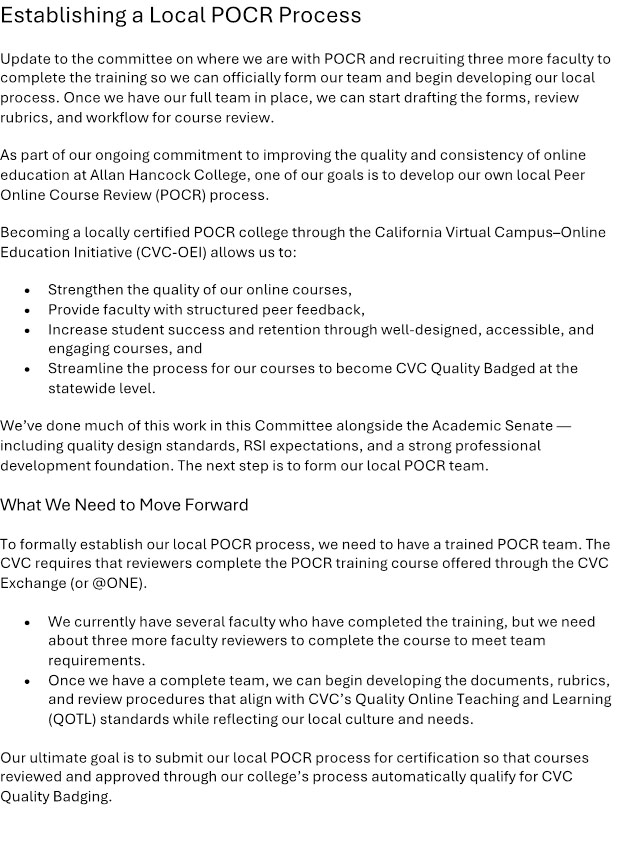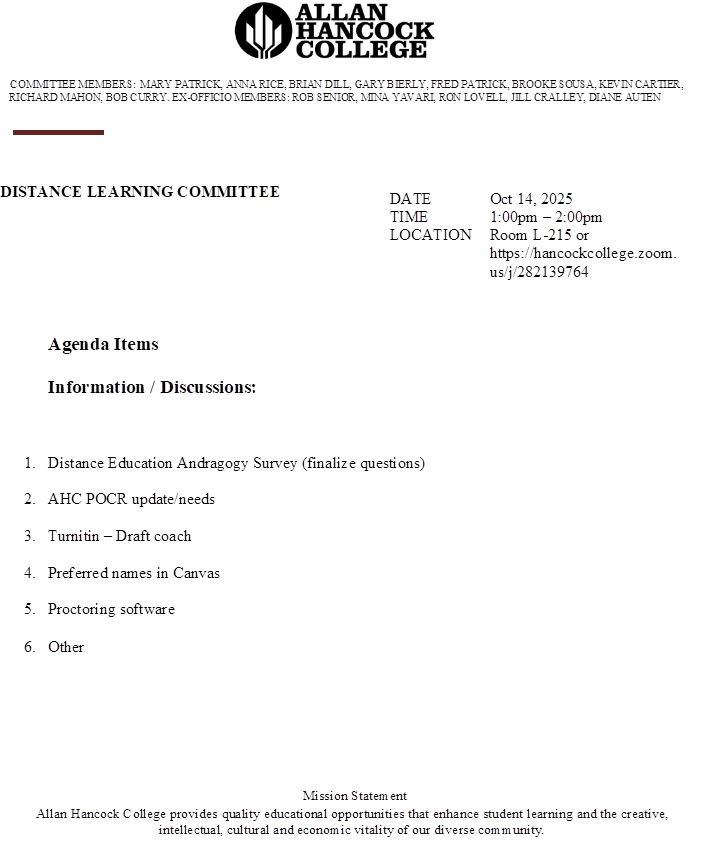 Notes: (1) The committee will conduct an anonymous evaluation of the Hancock DE course prospective faculty are required to take, probably sometime in November. (2) Hancock should have trained and locally approved “POCR evaluators.” POCR stands for “peer online course reviewer,” and once trained (the training takes ~40 hours), a faculty member can evaluate and approve Hancock DE courses. Approved courses appear on the statewide database of DE courses students from anywhere in the state can take and they are listed closer to the top of the list of sought after courses. (3) Turnitin has a tool Hancock pays for but does not use that allows students to submit their own work for a plagiarism report. The college will be turning it on; there was some discussion to indicate that “old fashioned” copy-and-paste plagiarism is no longer the central challenge—that spot has been taken by AI. (4) Starting next term, the college will turn on the tool in Canvas that allows students to designate their preferred name (Mike for Michael, Tere for Teresa, Bob for Robert, etc.). (5) The college (but not very many actual faculty) briefly used HonorLock, which is very expensive. That contract has ended and the college will pivot to Respondus.